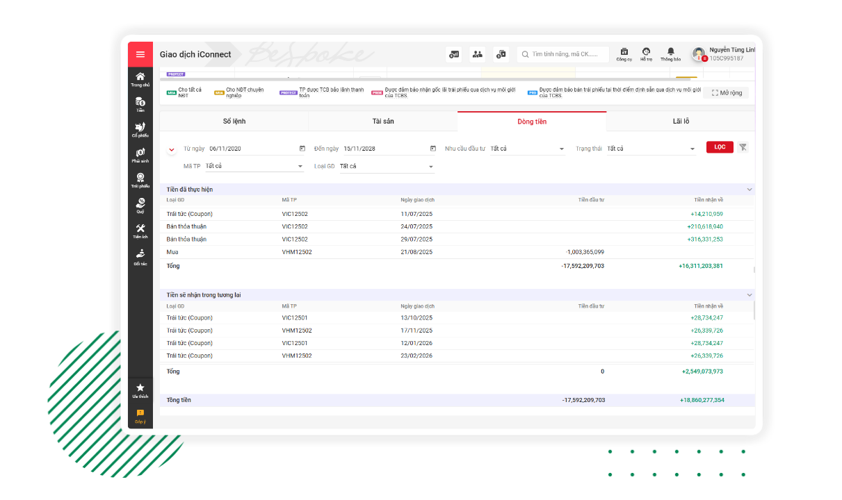- Trường hợp giữ đến đáo hạn: iConnect minh họa chi tiết các khoản gốc và lãi (coupon) mà Quý khách sẽ nhận, giả định theo mức lãi suất tham chiếu hiện tại với các kỳ coupon chưa xác định lãi suất.