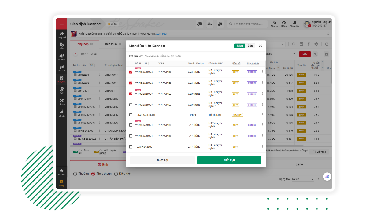 - Đa dạng hóa danh mục: một lần đặt lệnh có thể áp dụng cho tối đa 10 mã trái phiếu.