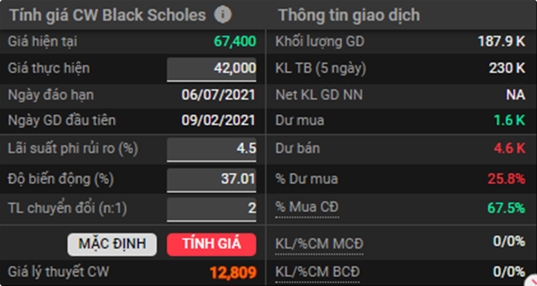 Nhà đầu tư có thể tùy chỉnh những tham số này để xác định giá lý thuyết của 1 chứng quyền bất kỳ. Sau khi đã điền đầy đủ các tham số trên, nhà đầu tư nhấn vào nút Tính Giá để xác định giá lý thuyết của chứng quyền theo những tham số đó. Nếu muốn trở về các tham số mặc định ban đầu, nhà đầu tư nhấn vào nút Mặc định.