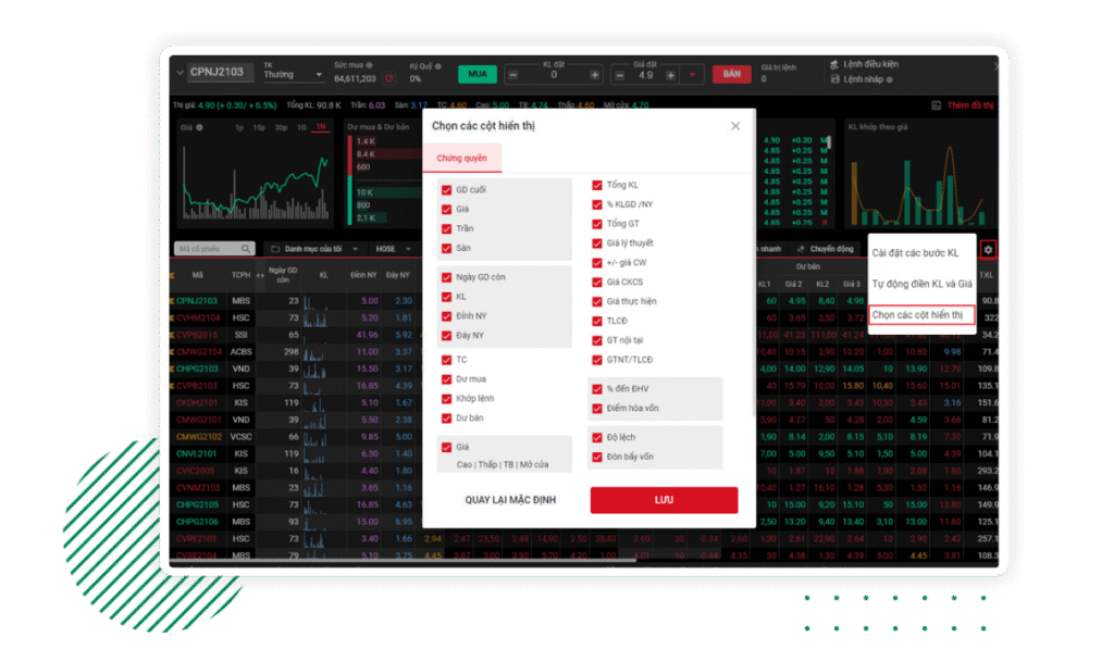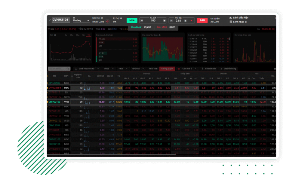 Người dùng có thể nhấn vào bất kỳ vùng thông tin nào của mã chứng quyền trên bảng giá để mở nhanh thẻ đặt lệnh, giúp rút ngắn các thao tác giao dịch