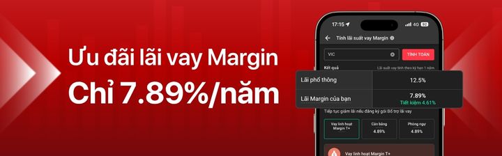 Vay margin lần đầu với lãi suất chỉ 7.89%/năm, hạn mức đến 5 tỷ VND, áp dụng trong 180 ngày kể từ ngày giải ngân đầu tiên.