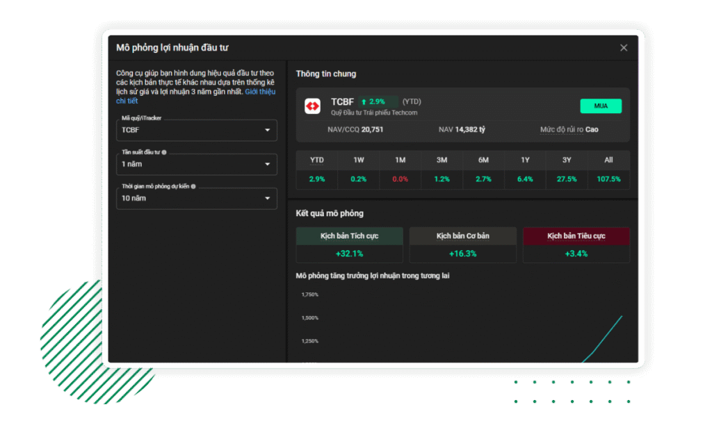 Tính năng đột phá mang đến trải nghiệm đầu tư trực quan, sử dụng dữ liệu giá thực tế trong 3 năm gần nhất để xây dựng 3 kịch bản: Tích cực, Cơ bản và Tiêu cực – giúp bạn ước tính tỷ suất sinh lời theo tần suất đầu tư hoặc tái đầu tư mong muốn.