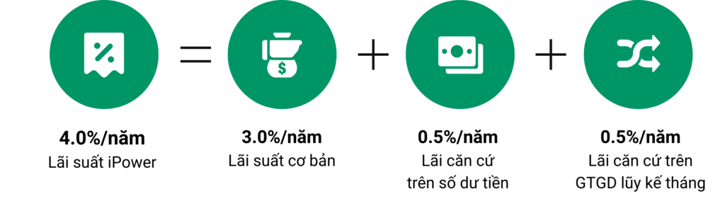 - Lãi suất iPower chỉ áp dụng khi số dư iPower đạt tối thiểu 5 triệu đồng và tối đa 60 tỷ đồng.