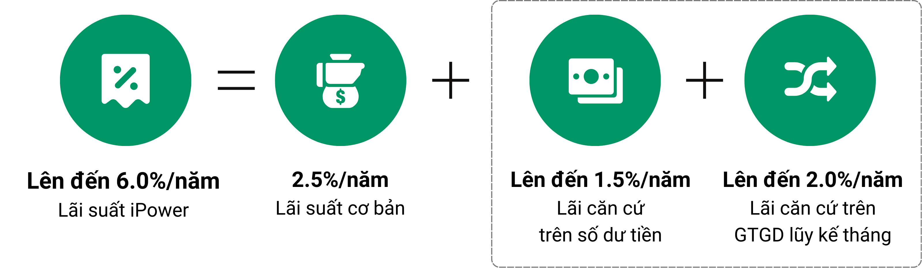 iPower là tài khoản tự động nhân lãi, tối ưu lợi ích từ số dư tiền. Với lãi suất linh hoạt theo số dư và giao dịch, bạn có thể tăng lãi suất lên đến 6.0%/năm.