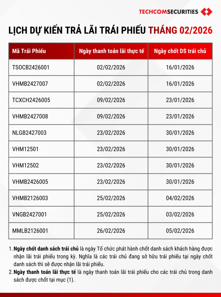 Lịch trả lãi Trái phiếu tháng 02/2026