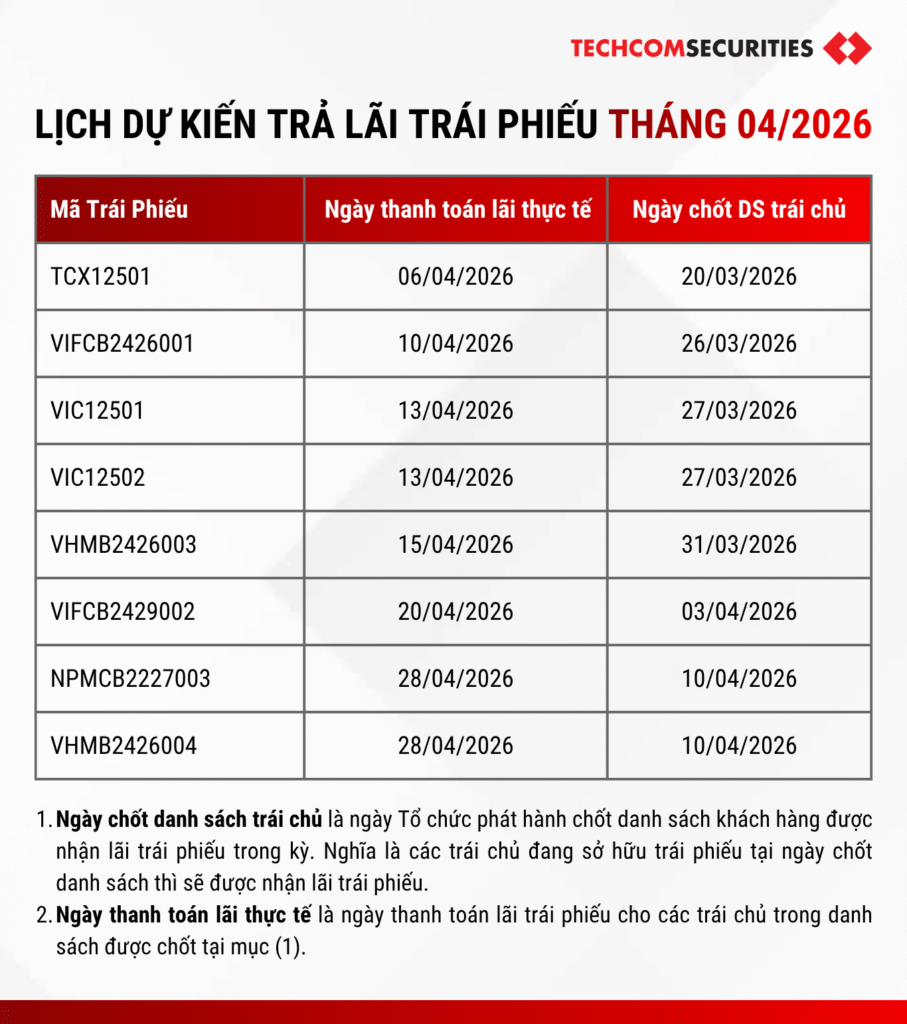 Lịch trả lãi Trái phiếu tháng 04/2026