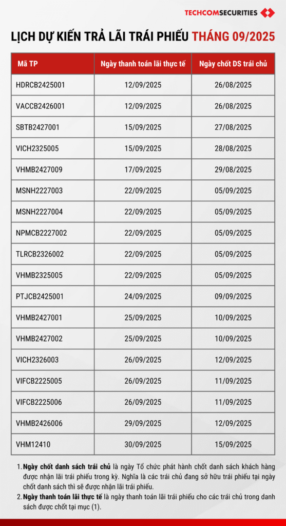 Lịch trả lãi Trái phiếu tháng 09/2025