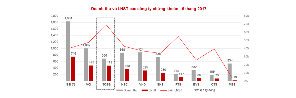Báo cáo tài chính quý 3/2017 và lũy kế 9 tháng đầu 2017 của Công ty TNHH Chứng khoán Kỹ Thương (Techcom Securities – TCBS) ghi nhận một quý hoạt động kinh doanh đặc biệt hiệu quả khi tất cả các nghiệp vụ đều bứt phá mạnh mẽ so với quý 2/2017, đồng thời tăng trưởng vượt bậc so với cùng kỳ năm ngoái. Các chỉ số hoạt động của TCBS trong quý 3/2017 vượt trội so với Q2/2017 khi doanh thu tăng 63% còn lợi nhuận tăng gấp đôi với 202%.