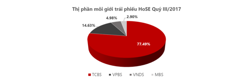 Tiếp nối tốc độ tăng trưởng kỷ lục từ nửa đầu năm 2017, trong quý 3, nghiệp vụ Sản phẩm đầu tư cho khách hàng cá nhân (Bao gồm trái phiếu doanh nghiệp và các quỹ đầu tư) vẫn duy trì phong độ ấn tượng với tổng doanh số bán ra đạt thêm gần 7.600 tỷ đồng. Nhờ đó, doanh thu từ mảng dịch vụ này của công ty đạt 263 tỷ đồng – gấp đôi so với quý 2 – đồng thời gấp gần 3 lần (288%) so với cùng kỳ năm ngoái, đóng góp tới 71% cấu doanh thu của TCBS trong quý 3 và lũy kế 9 tháng 2017. Không ngạc nhiên khi TCBS tiếp tục vượt xa các đối thủ trên thị trường về môi giới trái phiếu niêm yết trên sàn HOSE với thị phần áp đảo: 77,49%.