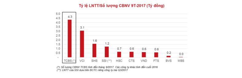 Doanh thu từ dịch vụ Tư vấn doanh nghiệp thuộc nghiệp vụ ngân hàng đầu tư đã tăng tốc mạnh mẽ hơn nhiều so với quý 2. Trong quý 3, dịch vụ này đạt doanh thu 99,2 tỷ đồng, tăng đến 236% so với quý 2, chiếm 27% cơ cấu doanh thu của công ty thông qua việc phát hành thành công hơn 7.000 tỷ đồng trái phiếu cho các doanh nghiệp tập đoàn lớn tại Việt Nam. Đồng thời, với số lượng hơn 20.000 tỷ đồng trái phiếu đang được “đặt hàng” bởi nhiều doanh nghiệp lớn từ giờ đến cuối năm, doanh thu của nghiệp vụ ngân hàng đầu tư hứa hẹn sẽ thực sự bùng nổ trong quý 4/2017. TCBS là công ty duy nhất trong top 10 không có vay nợ và có chỉ số lợi nhuận trên mỗi CBNV hiệu quả hàng đầu trên thị trường.