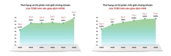 - Kết quả kinh doanh bứt phá trên đến từ cả bốn mảng kinh doanh trụ cột: Môi giới và lưu ký chứng khoán đột phá với thị phần môi giới quý 4/2025 tăng mạnh lên 9,0% trên sàn HOSE cùng với đó Cho vay ký quỹ và ứng trước tiền bán tiếp tục dẫn đầu thị trường với số dư gần 44 nghìn tỷ đồng tại cuối năm 2025. Đồng thời, Mảng ngân hàng đầu tư và Mảng phân phối trái phiếu và chứng chỉ quỹ tiếp tục giữ vững vị thế dẫn đầu và lợi thế cạnh tranh từ chuỗi giá trị toàn diện trong hệ sinh thái Techcombank.