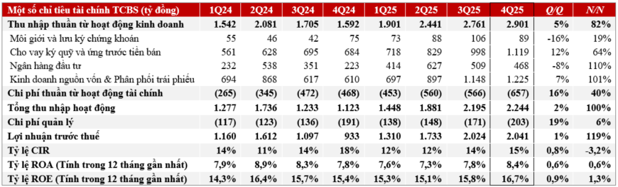 - Lợi nhuận trước thuế quý 4/2025 của TCBS tiếp tục vượt trội đạt 2.041 tỷ đồng, tăng gần 120% so với cùng kỳ năm ngoái. Năm 2025 lợi nhuận trước thuế cả năm của công ty ghi nhận ở mức kỷ lục 7.109 tỷ đồng, đạt 123% kế hoạch năm và tăng gần 50% so với cả năm 2024.