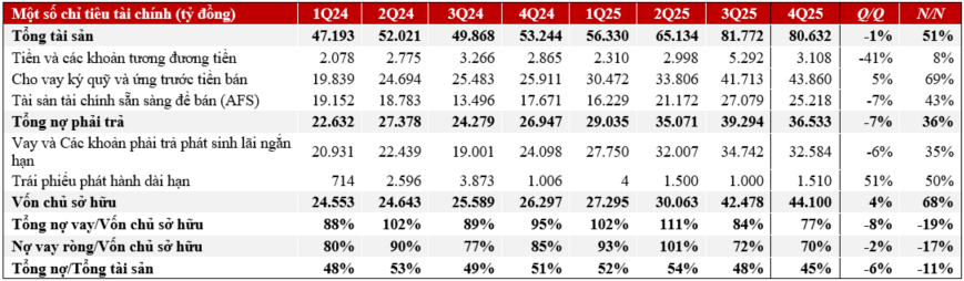 - Tổng tài sản của TCBS tại 31/12/2025 đạt hơn 80.632 tỷ đồng, tăng 51% so với cuối năm 2024. Động lực tăng trưởng chính đến từ tăng trưởng Cho vay ký quỹ và tăng đầu tư vào các tài sản tài chính nhằm tối ưu nguồn vốn.